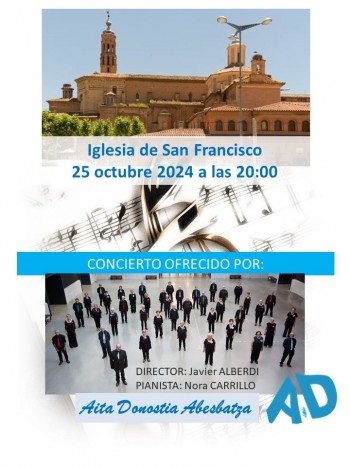 Kontzertua Tarazonan (2025-10-25, 20:00) Volver al listado Publicada el 14 Oct 2025 Urriaren 25ean larunbatarekin arratsaldeko 20:00etan Tarazonako San Frantzisko elizan kontzertu bat eskainiko du Aita Donostia abesbatzak.